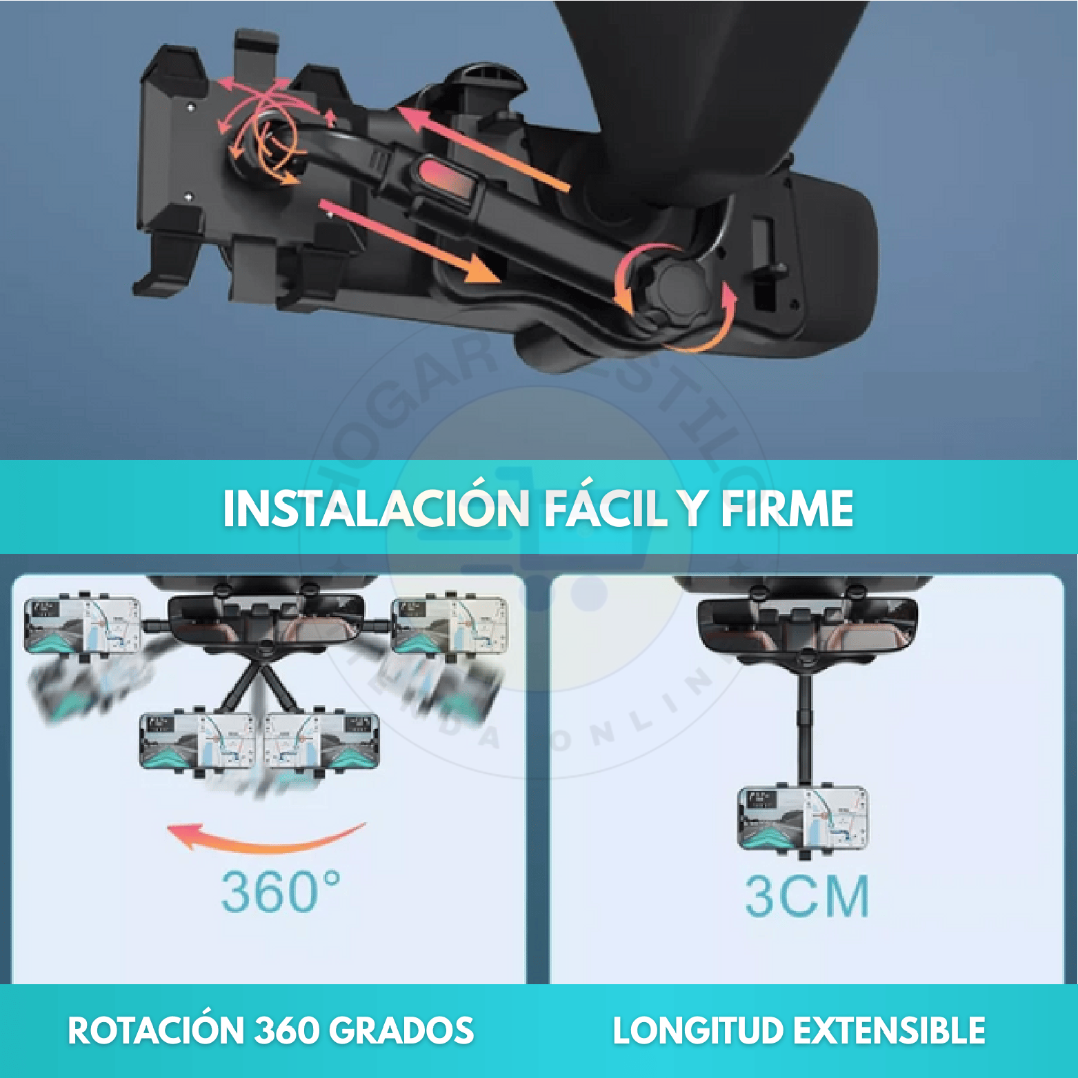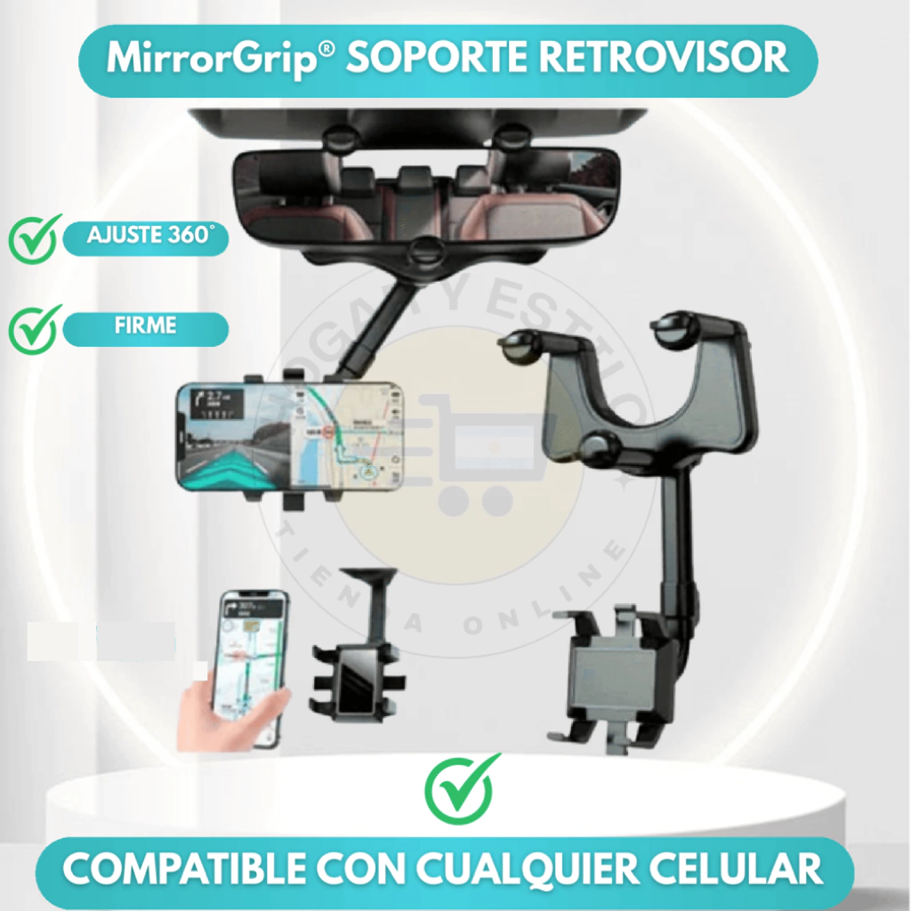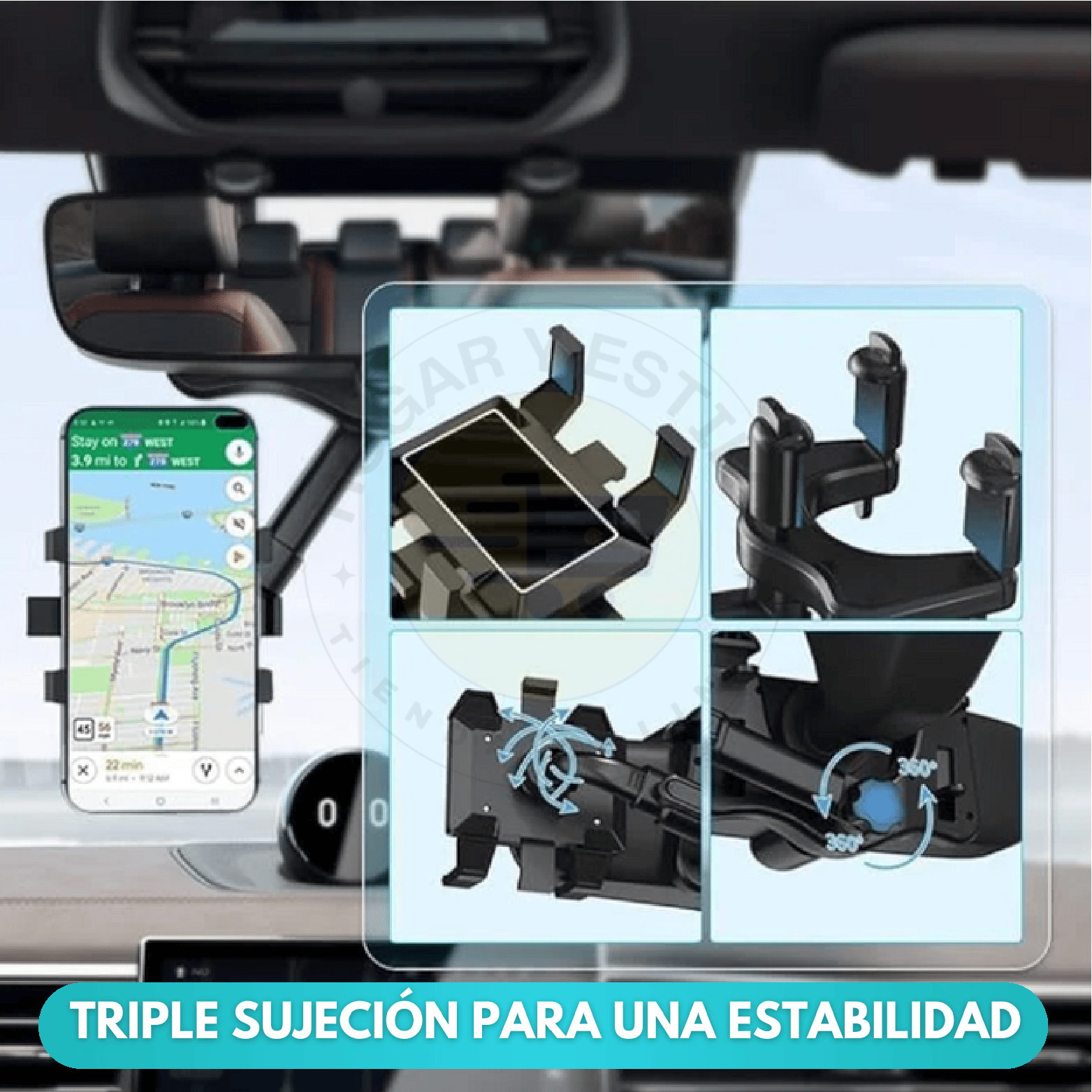 El MirrorGrip® Triple Soporte Retrovisor mantiene tu celular firme y en la posición ideal, sin vibraciones ni caídas inesperadas. Giralo 360° para un ajuste perfecto y disfrutá de una conducción sin distracciones.